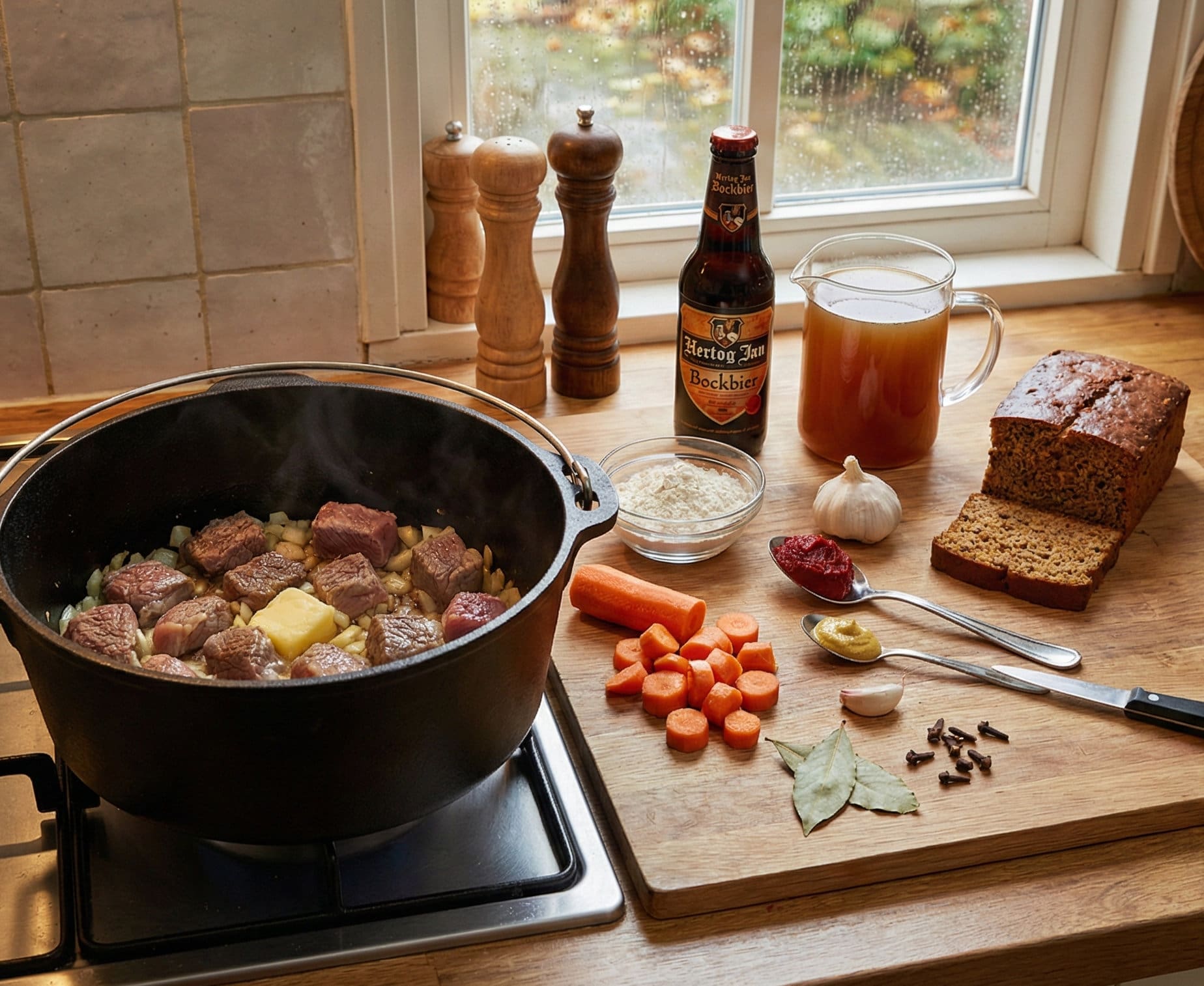 Stap 2. Voeg de tomatenpuree, mosterd en ketjap toe. Bak even aan. Doe daarna ook de laurier, kruidnagel, het bockbier en de runderbouillon toe. Kruimel ook de ontbijtkoek erdoor. Zorg dat het vlees net onder water staat.