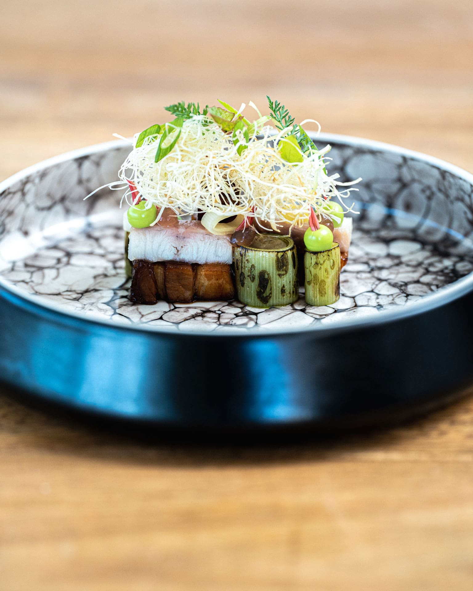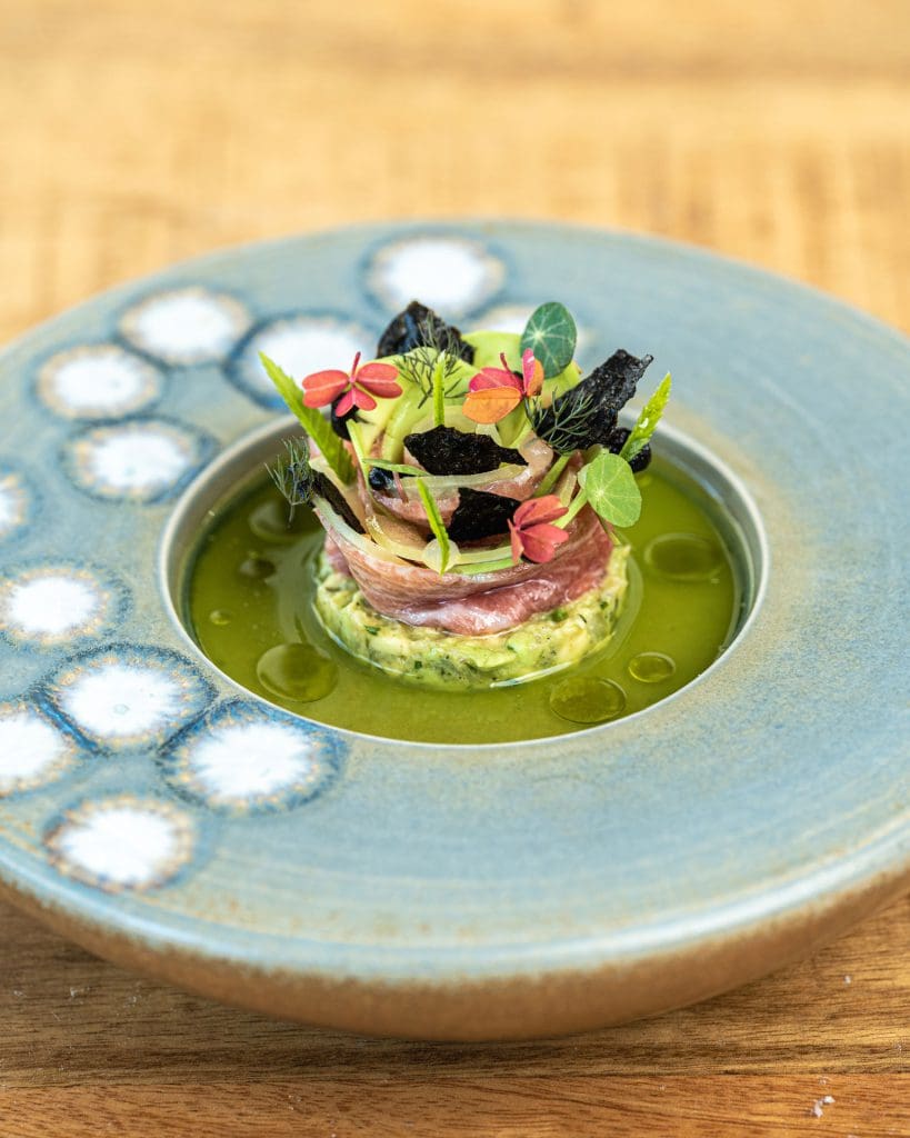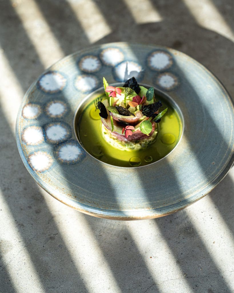 De creatieve gerechten van chef Joey blinken uit in technische perfectie, visuele presentatie en soms uitdagende complexiteit. Hij houdt ervan om levendige smaken te combineren met umami-invloeden uit de Aziatische keuken. Een voorbeeld hiervan is zijn interpretatie van de klassieke beef Wellington, waarin hij miso-mosterd en poeder van gedroogde groenteresten verwerkt voor extra diepgang. Ook met zijn kort gebakken langoustine verrast hij: die wordt verrijkt met een romige XO-saus op basis van schaaldieren, en vergezeld van langoustinemayonaise, yuzu-gel en zilte kaviaar voor een verfijnde smaakbeleving. Sluit de maaltijd af met een kop koffie of thee en laat je verrassen door een selectie van zoetigheden. Naast het zorgvuldig samengestelde menu (waarbij ook vegetarische opties beschikbaar zijn), kun je hier ook à la carte genieten van culinaire hoogstandjes.